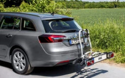 Questo portabici è dotato di binari in acciaio a doppio tubo ed è quasi adatto a tutti i tipi di ganci da traino. Il meccanismo di ripiegamento con fermo di sicurezza aggiuntivo permette di aprire il bagagliaio anche con le biciclette montate. Qui, il consumo di carburante è inferiore rispetto al portapacchi. È disponibile come accessorio una guida aggiuntiva per estendere il portabici a tre biciclette. Le biciclette sono fissate con un supporto per il telaio con serratura e cinghie di tiraggio con cricchetti. Estendibile a 3 biciclette con il binario supplementare 28020-19